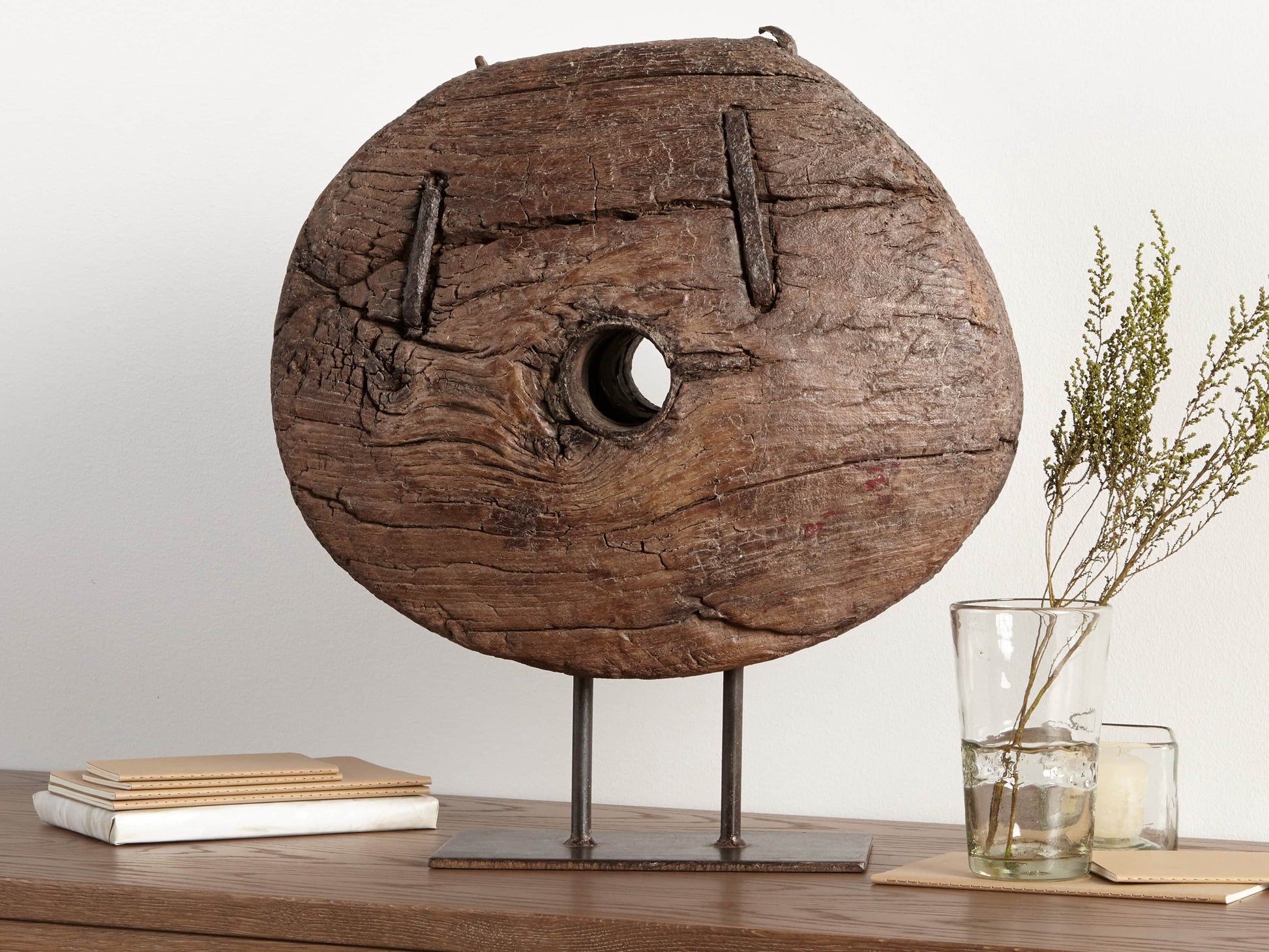- A work of art, this hand-selected teak wheel—once used to support an Indian wagon—is set atop a sturdy iron stand and will certainly become the center point of conversation in your home.